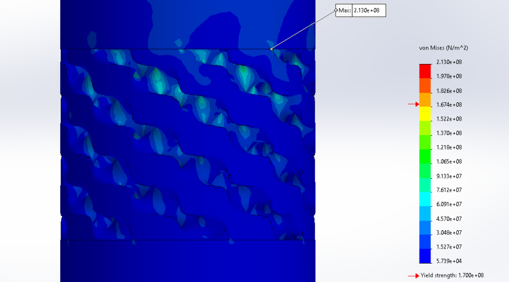 FEA of bolt lattice section. Note that the failure is uniform and catastrophic: a single, sudden point of failure.